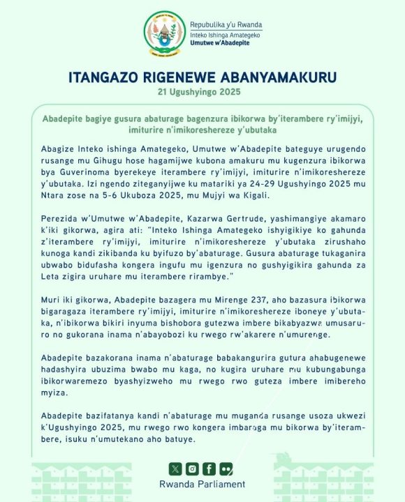 Itangazo rigenewe abanyamakuru ryasohowe n’Inteko Ishinga Amategeko mu ijoro ryo kuri uyu Gatanu, tariki ya 21 Ugushyingo 2025, rivuga ko izo ngendo zizabera mu Ntara zose ariko tariki 25 na 26, Ukuboza 2025 bikazabera mu Mujyi wa Kigali.