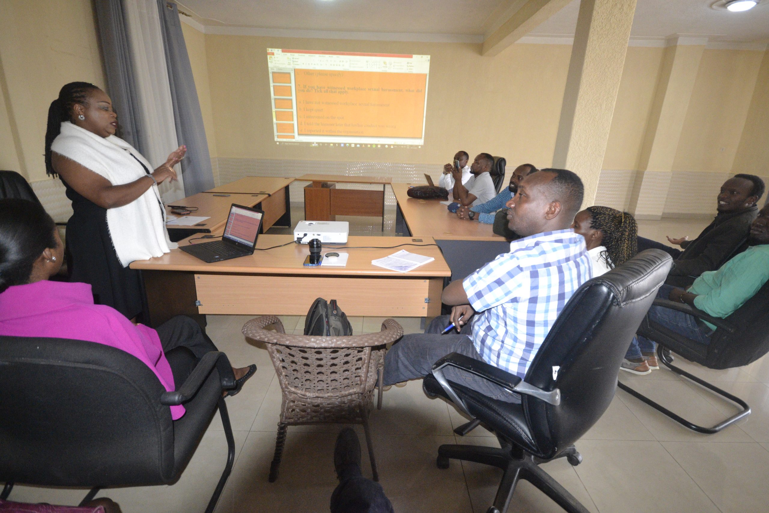 Ati “Birazwi ko hari inzego nyinshi z’ubuyobozi zivugwamo ikibazo ku ihohoterwa rishingiye ku gitsina, aho usanga umukoresha ahora aha amahirwe ya hato na hato umuntu umwe yo kujya mu butumwa bw’akazi, akamutumira kujya gusangira ariko afite icyo yishakira. Aho niho duhera dukangura nyir’ubwite -victim, kugira imbaraga zo kwirwanira.”