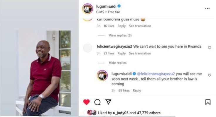Lugumi yasubije agira ati: “Muzambona vuba mu cyumweru gitaha. Babwire bose ko muramu wanyu agiye kuza.”