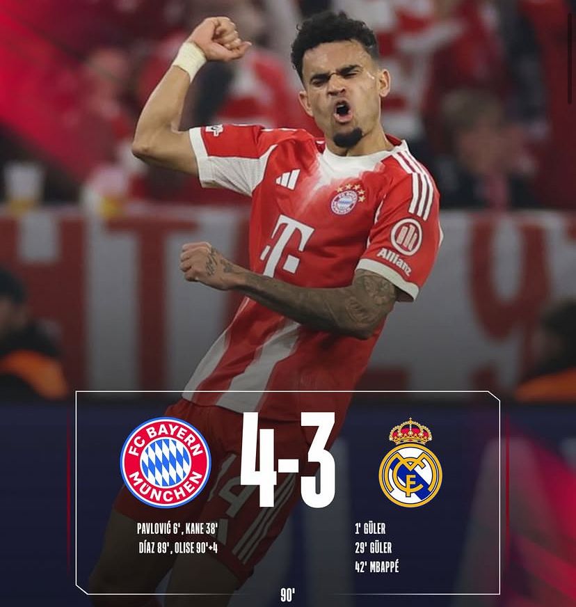 Mu minota y’inyongera, ku munota wa 90+4, Michael Olise yatsinze igitego cya kane, bituma Bayern Munich isezerera Real Madrid ku giteranyo cy’ibitego 6-4, ikomeza muri 1/2 cy’irushanwa.
