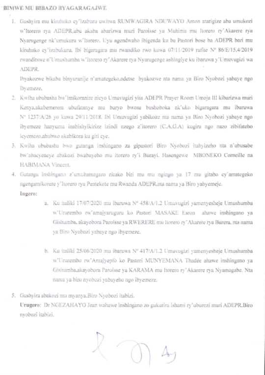 Mu nyandiko Ikinyamakuru Panorama gifitiye kopi, hagaragaramo imyanzuro 13 yafashwe mu nama yo ku wa 13/08/2020 yarimo uruhande rw’Umuvugizi wungirije Rev Karangwa John ari nawe wayiyoboye, ishyirwaho umukono na we hamwe na Umuhoza Eulerie Ushinzwe Imari n’Ubutegetsi, na Past. Jean Paul Ntaganda Umujyanama mu by’imari n’ubuyobozi.