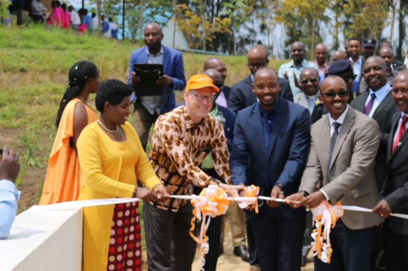Umuyobozi w’Akarere ka Burera Uwambajemariya Florence, Uwashinze umurya Partners In Health Dr Paul Farmer, Umuyobozi Mukuru wa RBC Dr Sabin (RBC), Umuyobozi wa Partners In Health Dr Joel n’Umunyamabanga Nshingwabikorwa w’Intara y’Amajyaruguru Jabo Paul bafungura inzu y’icumbi i Butaro (Ifoto/Ferdinand)