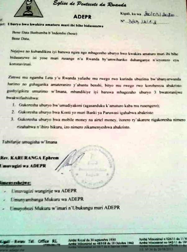 Mu ibaruwa No 329/2/1.2 yo ku wa 20 Werurwe 2020, Umuvugizi wa ADEPR Rev. Karuranga Ephrem yandikiye abashumba b’indembo bose, yaberekaga uburyo bwo kwakira amaturo muri ibi bihe bidasanzwe.