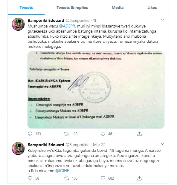 Undi na we ati “Amaturo n’icyacumi biteganywa na Bibiliya ariko iki si igihe cyo gutanga nomero za Konti ndetse na Telefoni zo kunyuzaho amafaranga. Ese tuzamenya zizacungwa nande? Ahubwo hari hakwiye gukorwa mu kigega tugatangira kugoboka abadashobora kubona ibibatunga muri ibi bihe bikomeye. Abantu barushaho kubona no kumva imbaraga z’itorero.”
