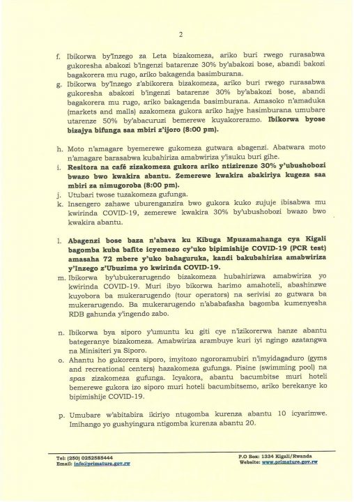 Uretse utu turere dukuwe mu kato, ikindi ni uko mu nama hazajya hakirwa 30 ku ijana by’ubushobozi bw’aho inama yakirirwa kandi abayitabira bose bagomba kuba bipimishije COVID-19 mu gihe barenze 20. Izindi ngamba zari zisanzweho zizakomeza kubahirizwa uko byateganyijwe. Utubari n’ibikorwa by’imikino y’amahirwe bizakomeza gufunga.