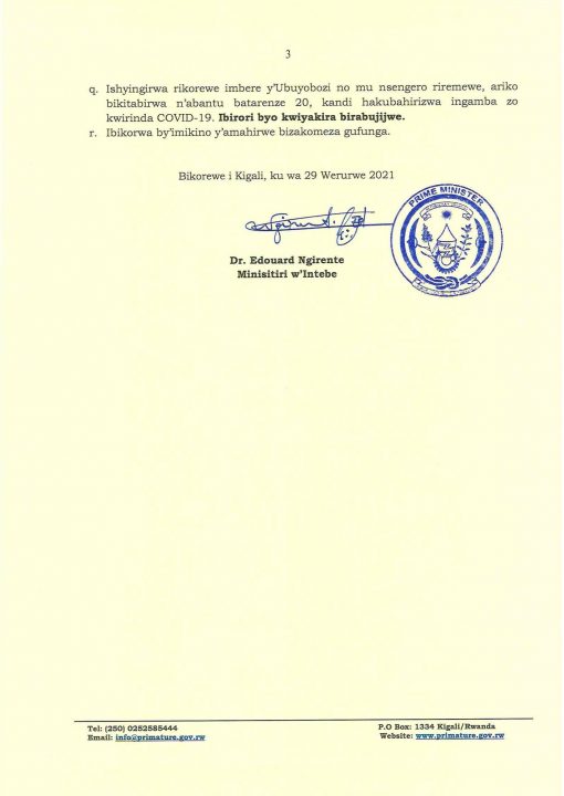 Ibiro bya Minisitiri w’Intebe, byashyize ahagaragara ingamba nshya zo gukomeza gukumira ikwirakwiza rya COVID-19, muri zo harimo ko uturere twa Bugesera, Gisagara na Nyanza twari twarashyizwe mu kato, dukuwemo ibikorwa bigakomeza kimwe n’ahandi mu gihugu.