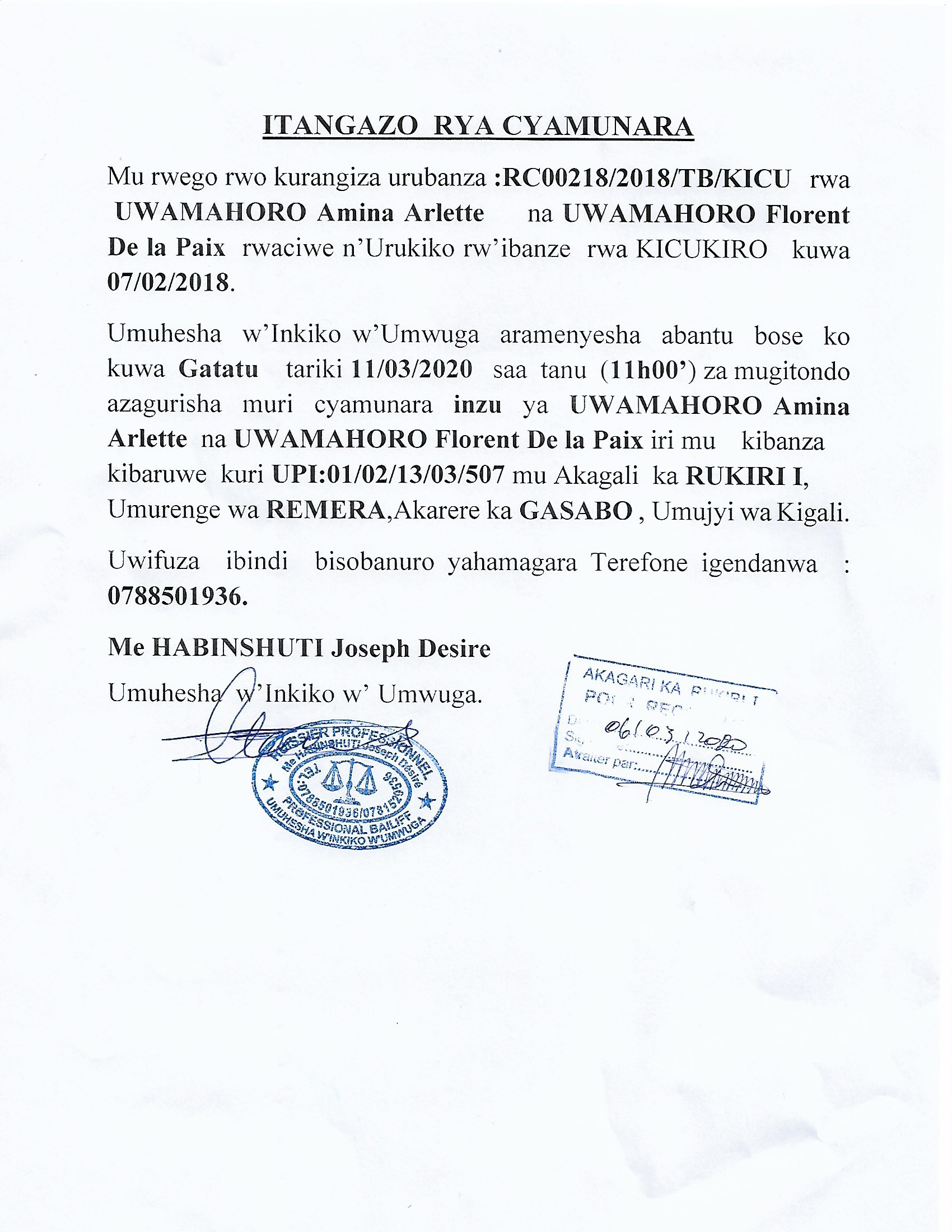 Huye: Cyamunara y’umutungo utimukanwa (Ubutaka) ubaruye kuri UPI: 2/04/05/04/1515 (Sqm 15851); mu murenge wa Kinazi, Akagari ka Rubona, Umudugudu wa Remera