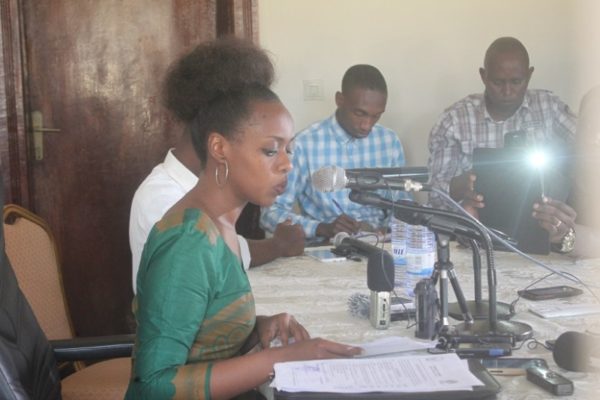 Shima Diane Rwigara, mu kiganiro n’abanyamakuru, arasoma inyandiko yagejeje kuri Polisi agaragaza akarengane kakorewe abamusinyi ngo abone amahirwe yo kuziyamamaza (Photo/Umuseke)