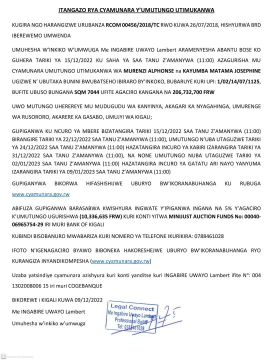 Gasabo: Cyamunara y’ubutaka bunini bwubatseho ibiraro by’inkoko bufite UPI: 1/02/14/07/1125, mu murenge wa Rusororo, Akagari ka Nyagahinga, Umudugudu wa Kanyinya