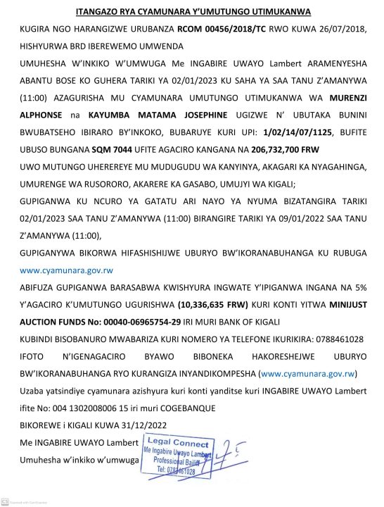 Gasabo: Cyamunara y’ubutaka bunini bwubatseho ibiraro by’inkoko bufite UPI: 1/02/14/07/1125; mu murenge wa Rusororo, Akagari ka Nyagahinga, Umudugudu wa Kanyinya