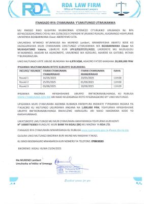 Gatsibo: Cyamunara y’umutungo utimukanwa ubaruye kuri UPI: 5/03/07/01/4222 (Sqm 4,878); mu murenge wa Kiziguro, Akagari ka Agakomeye, Umudugudu wa Akabingo