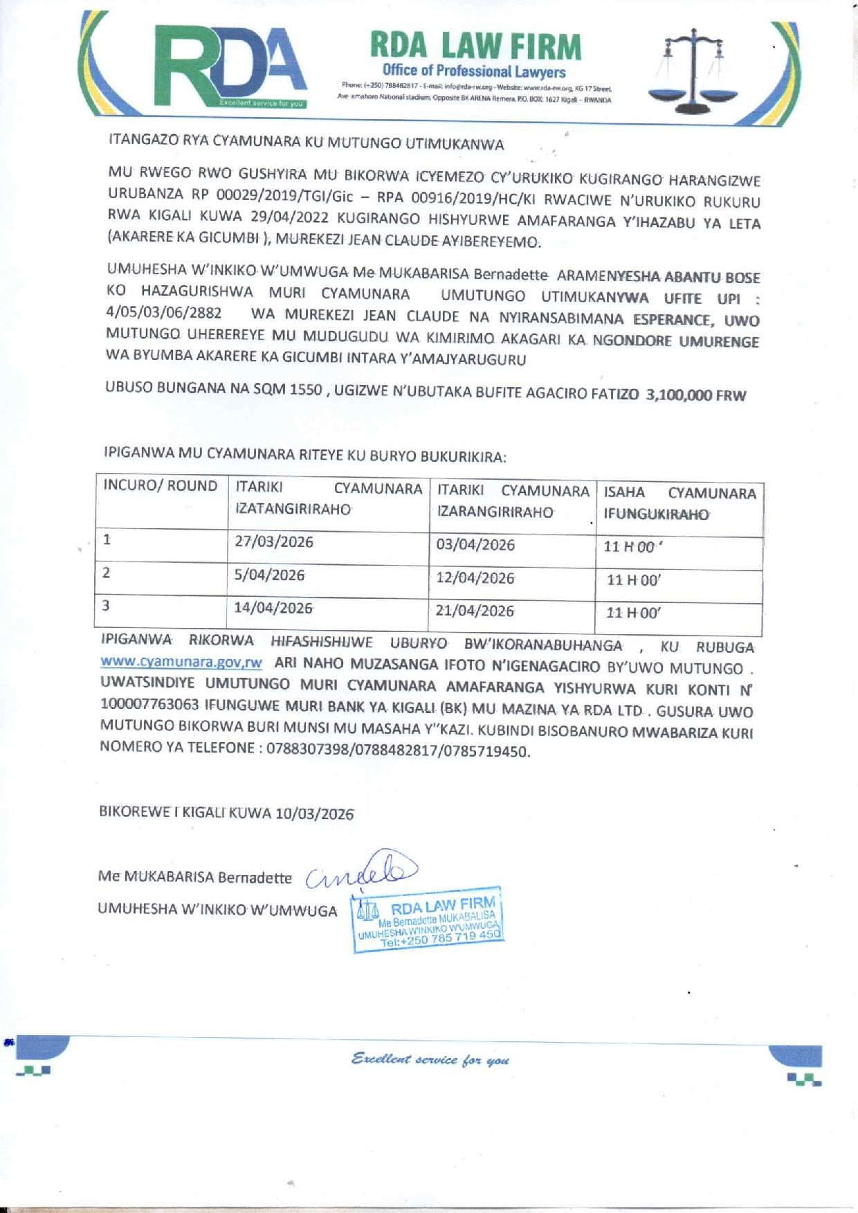 Kicukiro: Cyamunara y’ikibanza n’inzu bibaruye kuri UPI: 1/03/01/05/2489 na UPI: 1/03/01/05/7373 mu murenge wa Gahanga, Akagari ka Nunga