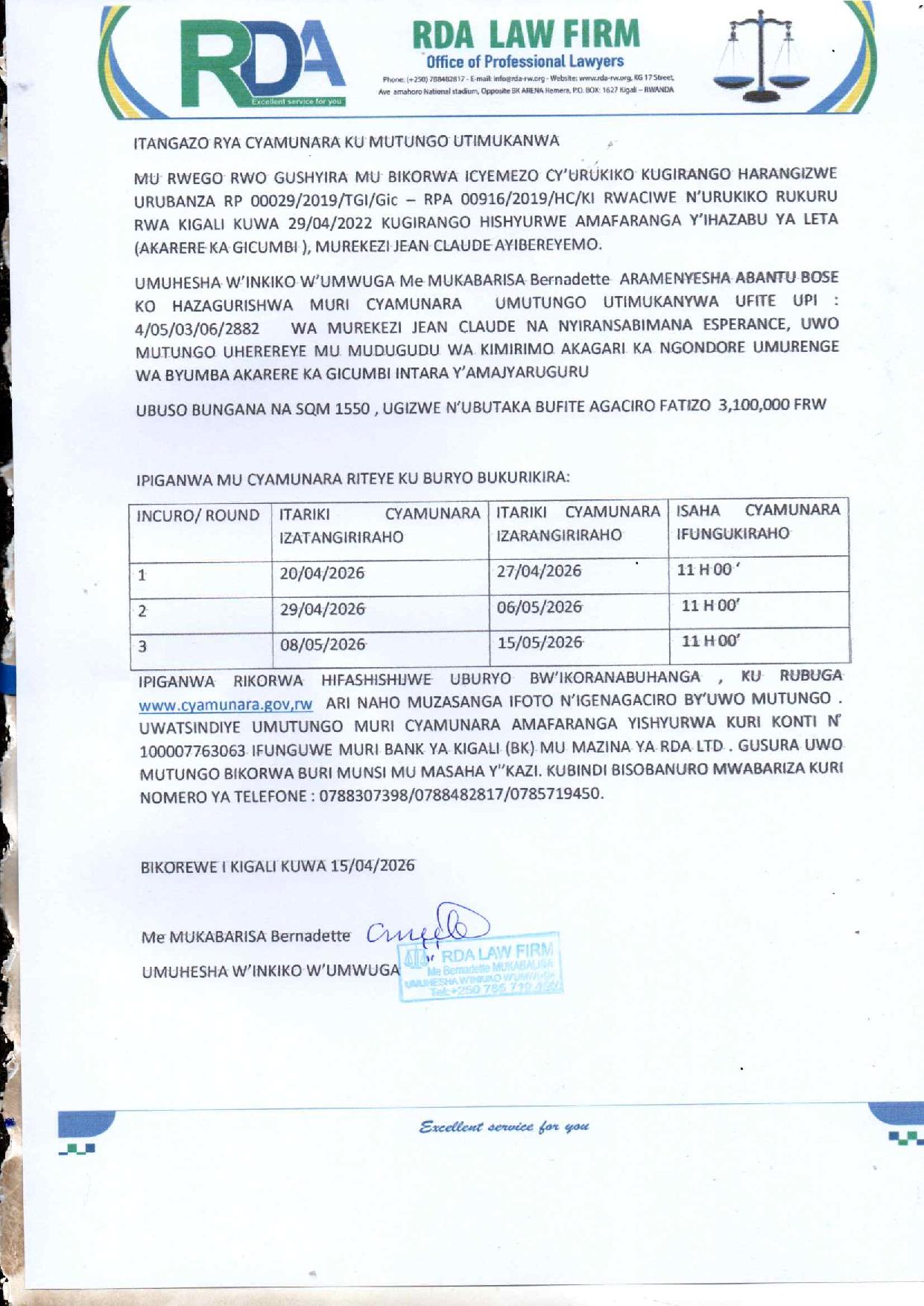 Gicumbi: Cyamunara y’umutungo utimukanwa ubaruye kuri UPI: 4/05/03/06/2882 (Sqm: 1550); mu Murenge wa Byumba, Akagari ka Ngondore, Umudugudu wa Kimirimo
