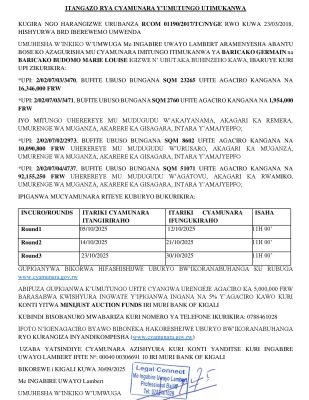 Gisagara: Cyamunara y’imitungo itimukanwa ibaruye kuri UPI: 2/02/07/03/3470; UPI: 2/02/07/03/3471; UPI: 2/02/07/02/2973 na UPI: 2/02/07/04/4737; mu murenge wa Muganza n’uwa Rwamiko