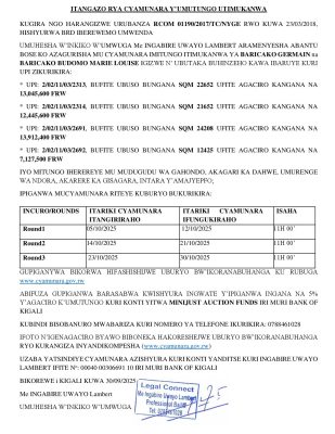 Gisagara: Cyamunara y’imitungo itimukanwa ibaruye kuri UPI: 2/02/11/03/2313; UPI: 2/02/11/03/2314; UPI: 2/02/11/03/2691 na UPI: 2/02/11/03/2692; mu murenge wa Ndora, Akagari ka Dahwe, Umudgudu wa Gahondo