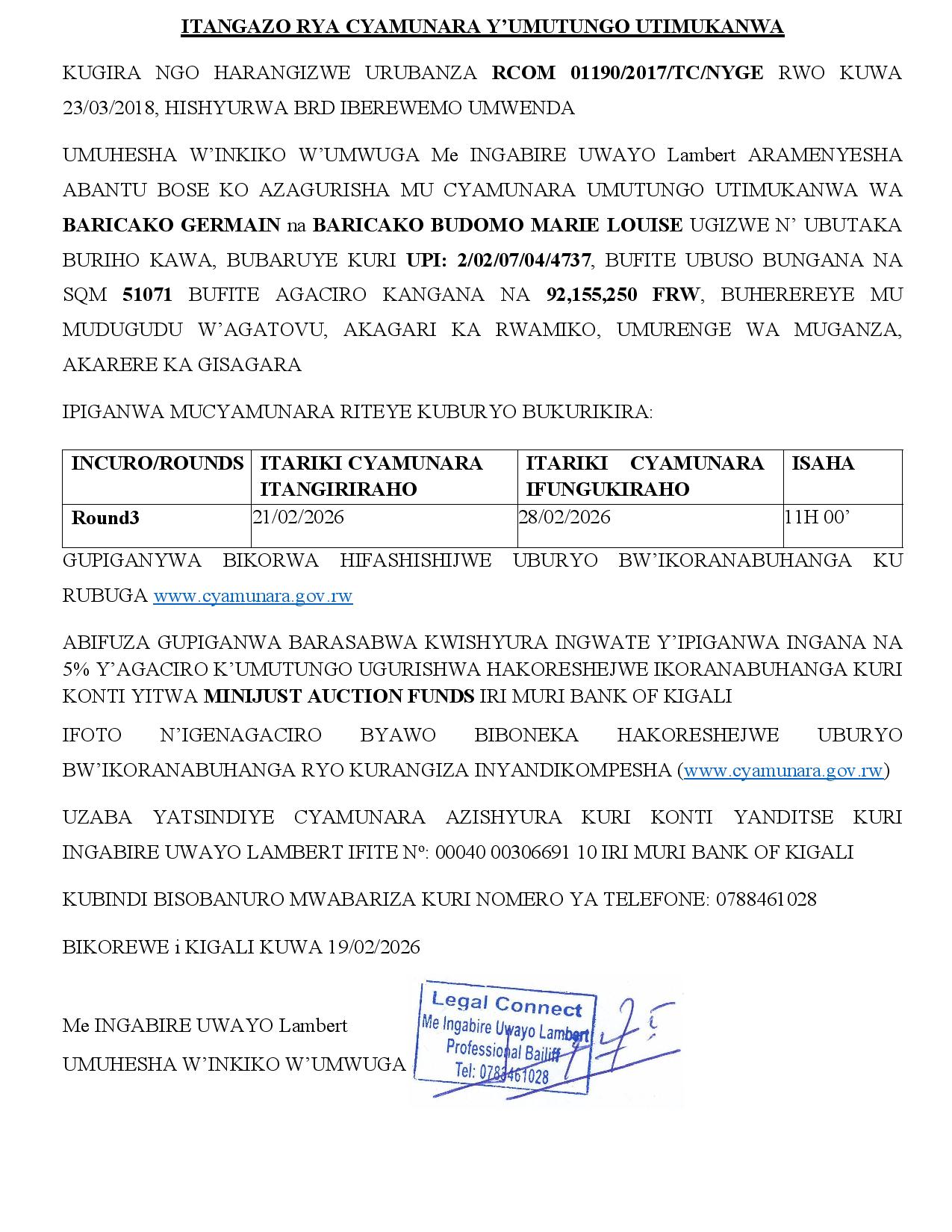 Nyamasheke: Cyamunara y’umutungo utimukanwa ubaruye kuri UPI: 3/07/10/01/2261 (Sqm: 106); mu murenge wa Macuba, Akagari ka Gatare, Umudugudu wa Kayenzi