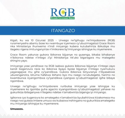 Mu itangazo RGB yashyize hanze ku tariki 10 Gicurasi 2025, rigira riti “Urwego rw’lgihugu rw’lmiyoborere ruramenyesha abantu bose ko rwambuye icyemezo cy’ubuzimagatozi Grace Room nka Minisiteriya ihuriwemo n’indi miryango kubera kutubahiriza ibikubiye mu itegeko rigena imitunganyirize n’imikorere bÿimiryango ishingiye ku myemerere,’’