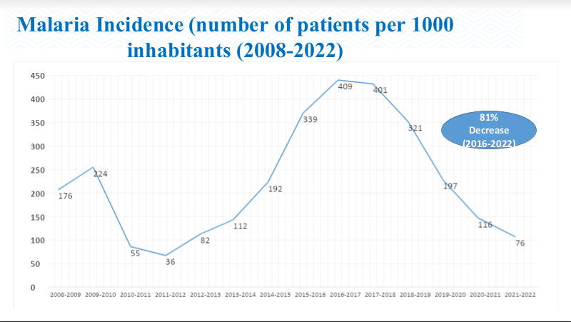 RBC says infection rates have dropped from 409 cases per 1,000 people in 2016 to just 76 cases per 1,000 people in 2022. Malaria deaths fell by more than 89 percent over the same period.