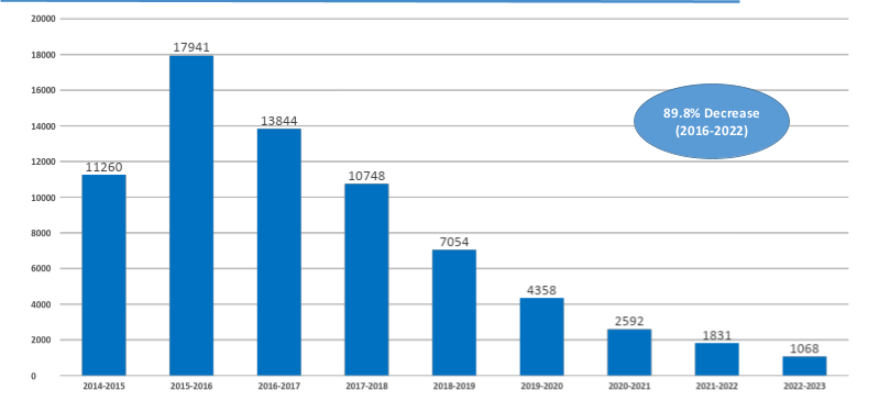 The number of uncomplicated cases decreased from 3.9 million to less than a million from 2018 to 2022. In contrast, deaths decreased to 264 in 2018.