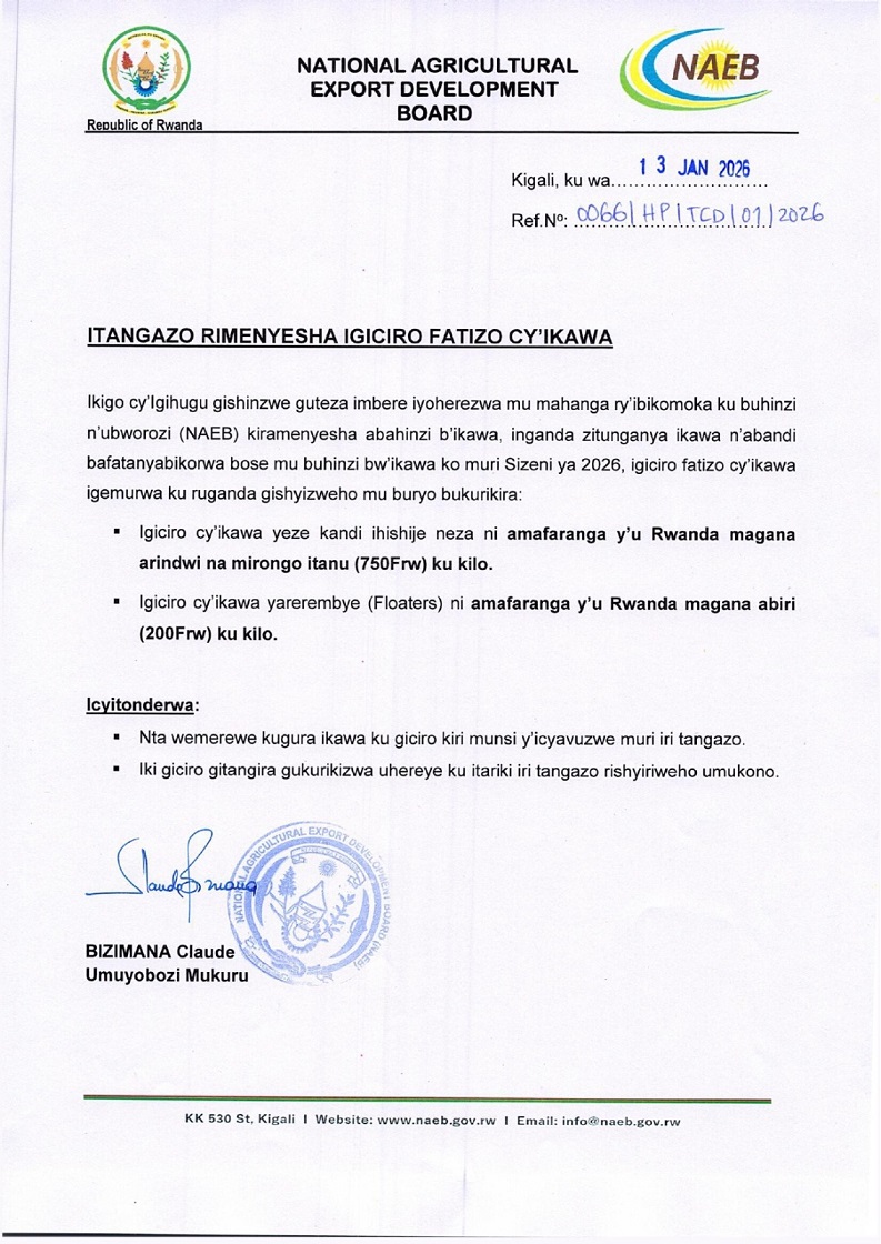 Ikigo cy’Igihugu gishinzwe guteza imbere iyoherezwa mu mahanga ry’ibikomoka k’ubuhinzi n’ubworozi (NAEB) cyamenyesheje abahinzi b’ikawa, inganda zitunganya ikawa n’abandi bafatanyabikorwa bose mu buhinzi bw’ikawa ko muri Sizeni ya 2026, igiciro fatizo cy’ikawa igemurwa ku ruganda gishyizweho mu buryo bukurikira: