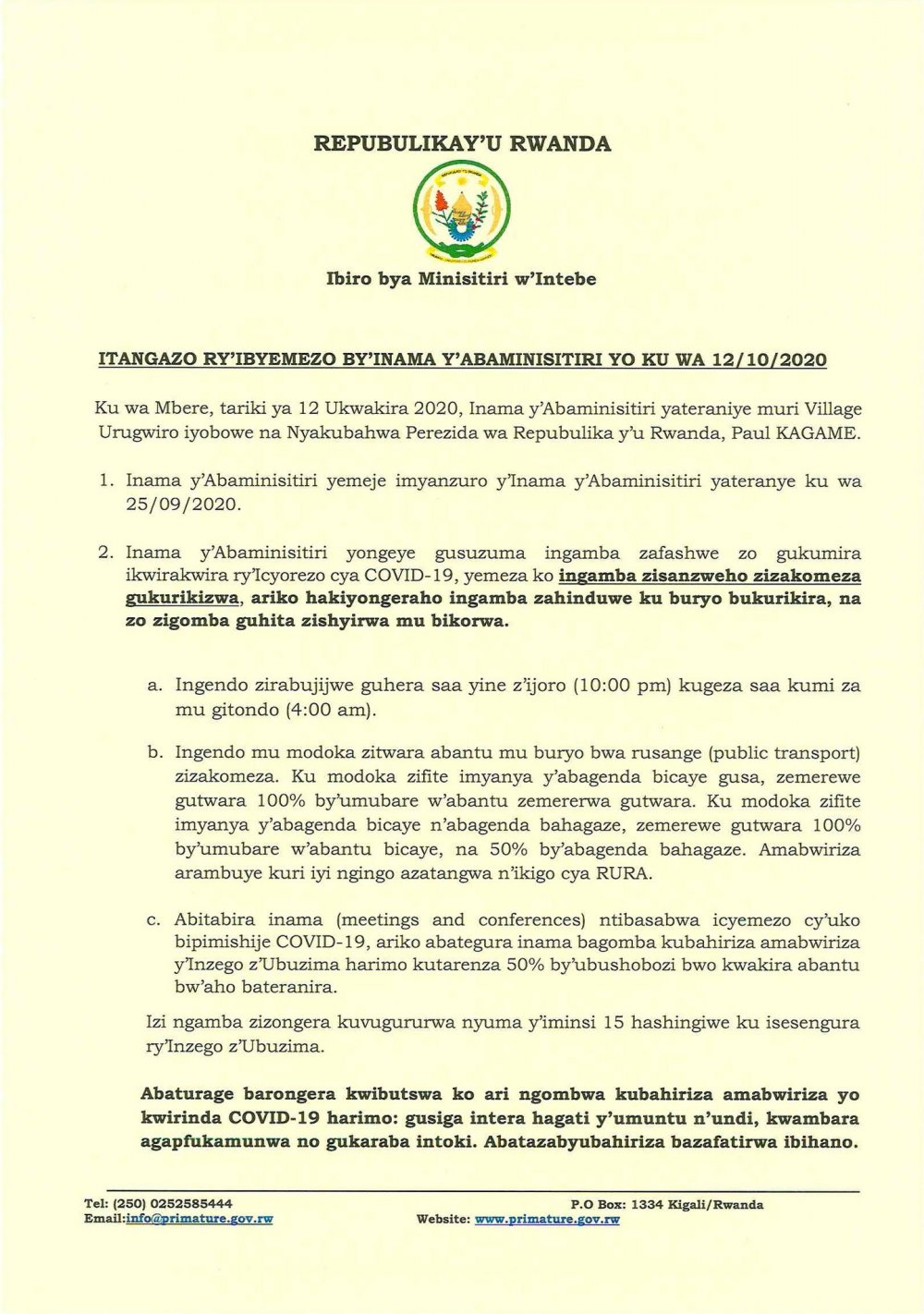 Inama y’Abaminisitiri yo ku wa 12 Ukwakira 2020, yayobowe na Perezida Paul Kagame, umwe mu myanzuro yafashe ni uko imodoka zitwara abantu mu buryo bwa rusange zemerewe gutwara abantu buzuye ku bagenda bicaye mu gihe izifite imyanya igendamo abahagaze izajya yakira kimwe cya kabiri cyabo.