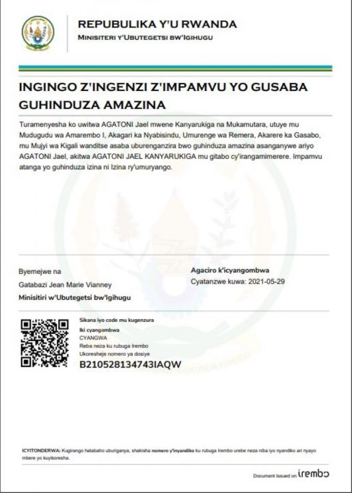 Ingingo z’ingenzi z’impamvu yo gusaba guhindura izina “AGATONI Jael”