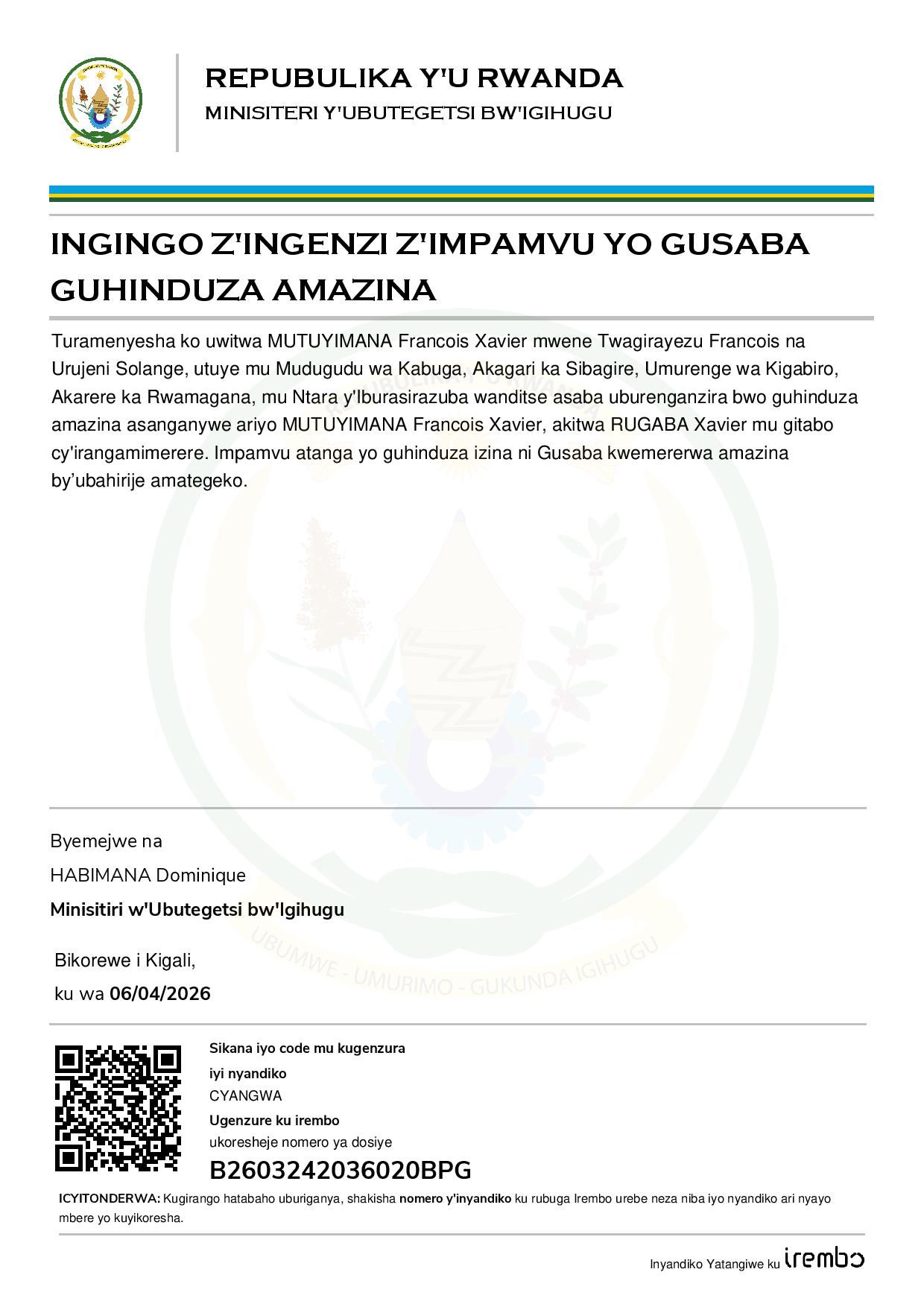 Ingingo z’ingenzi z’impamvu yo gusaba guhinduza amazina ya MUTUYIMANA Francois Xavier