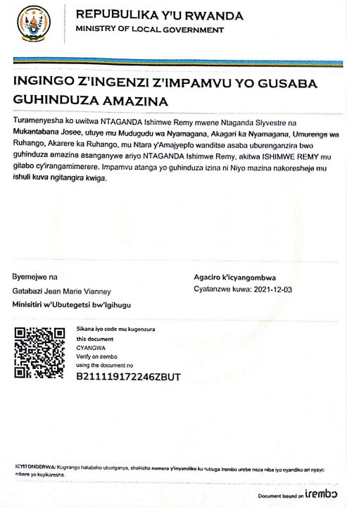 Ingingo z’ingenzi z’impamvu yo gusaba guhinduza amazina ya NTAGANDA Ishimwe Remy