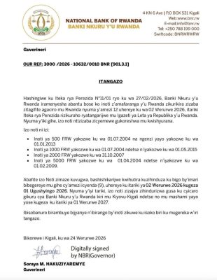 Mu itangazo ryashyizweho umukono na Guverineri wa BNR, Soraya M. Hakuziyaremye, BNR yasobanuye ko izo noti zitagifite agaciro mu Rwanda nyuma y’amezi 12 uhereye ku wa 02 Werurwe 2026, igihe Iteka rya Perezida ryatangarijwe mu Igazeti ya Leta.