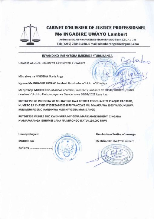 Inyandiko imenyesha imikirize y’urubanza hagati ya MUHIRE Eric na NIYIGENA Marie ange