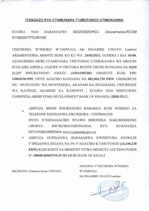 Huye: Cyamunara y’umutungo utimukanwa (Ubutaka) ubaruye kuri UPI: 2/04/05/04/1515 (Sqm 15851); mu murenge wa Kinazi, Akagari ka Rubona, Umudugudu wa Remera