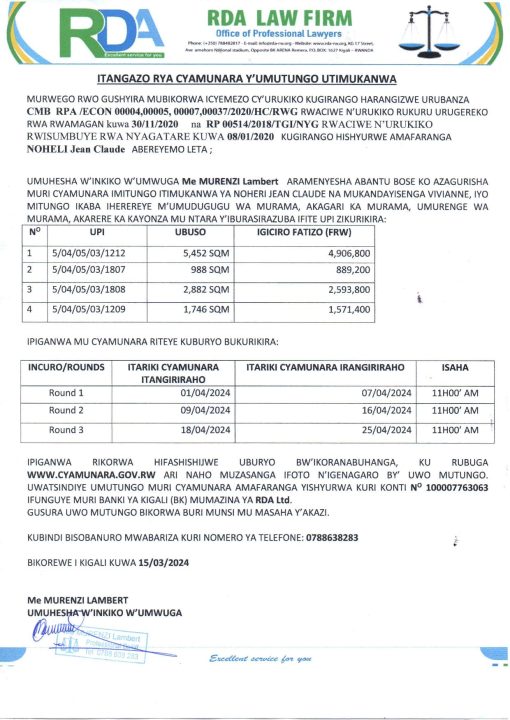 Kayonza: Cyamunara y’imitungo itimukanwa ubaruye kuri UPI: 5/04/05/03/1212 (Sqm 5,432); UPI: 5/04/05/03/1807 (Sqm 988); UPI: 5/04/05/03/1808 (Sqm 2,882); UPI: 5/04/05/03/1209 (Sqm 1,746); murama, Akagari ka Murama, Umudugudu wa Murama