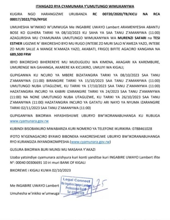 Kicukiro: Cyamunara y’ibikoresho byo mu rugo birimo intebe zo muri salo n’ameza yazo, intebe zo muri salle a manger n’ameza yazo, akabati na Frigo; mu murenge wa Gahanga, Akagari ka Kerembure, Umudugudu wa Kimena