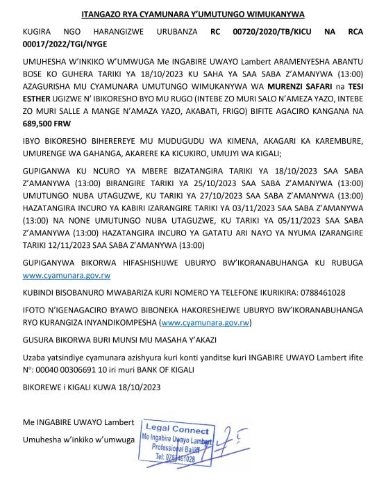 Kicukiro: Cyamunara y’ibikoresho byo mu rugo birimo intebe zo muri salo n’ameza yazo, intebe zo muri salle a manger n’ameza yazo, akabati na Frigo; mu murenge wa Gahanga, Akagari ka Kerembure, Umudugudu wa Kimena