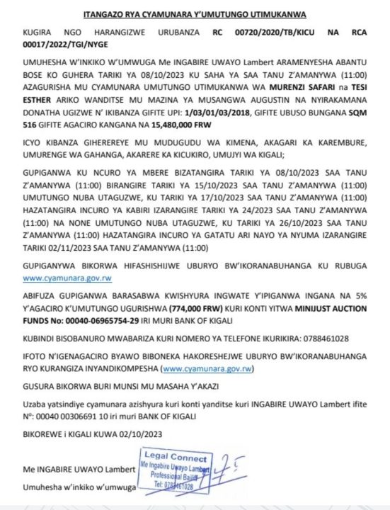 Kicukiro: Cyamunara y’ikibanza kibaruye kuri UPI: 1/03/01/03/2018; mu murenge wa Gahanga, Akagari ka Karembure, Umudugudu wa Kimena