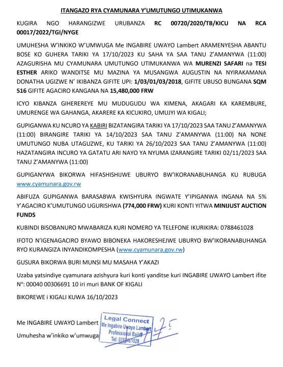 Kicukiro: Cyamunara y’ikibanza kibaruye kuri UPI: 1/03/01/03/2018 (Sqm 516); mu murenge wa Gahanga, Akagari ka Karembure, Umudugudu wa Kimena