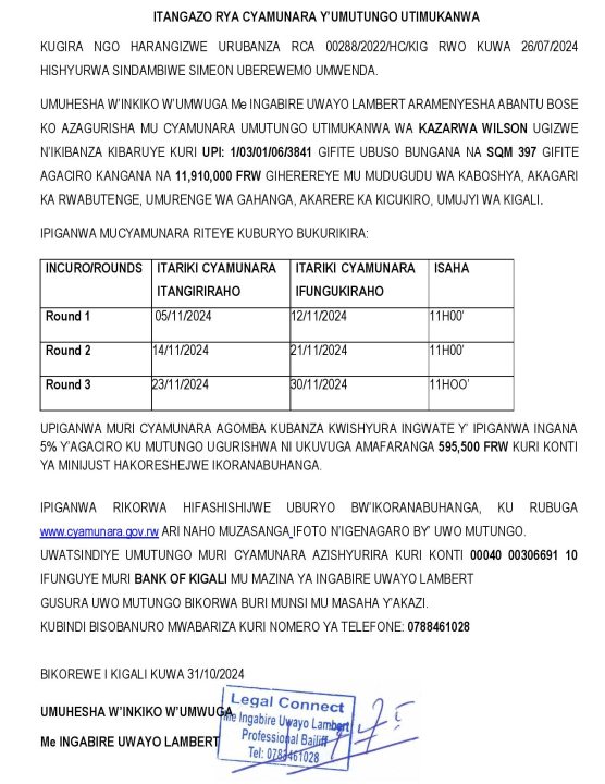 Kicukiro: Cyamunara y’ikibanza kibaruye kuri UPI: 1/03/01/06/3841 (Sqm 397); mu murenge wa Gahanga, Akagari ka Kabutenge, Umudugudu wa Kaboshya