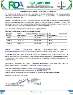 Kicukiro: Cyamunara y’ikibanza kibaruye kuri UPI: 1/03/08/05/182 (Sqm: 13,516); mu murenge wa Masaka, Akagari ka Mbabe, Umudugudu wa Ngarama