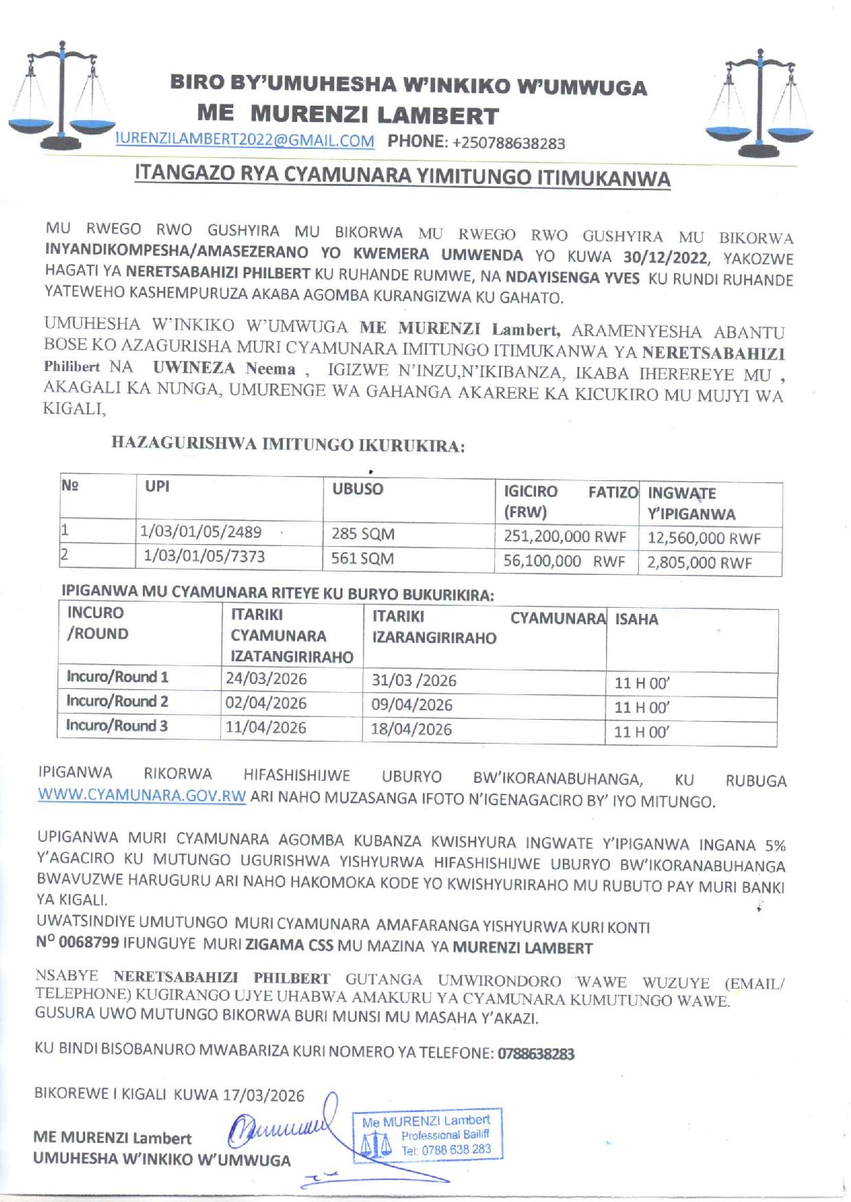 Kicukiro: Cyamunara y’ikibanza n’inzu bibaruye kuri UPI: 1/03/01/05/2489 na UPI: 1/03/01/05/7373 mu murenge wa Gahanga, Akagari ka Nunga