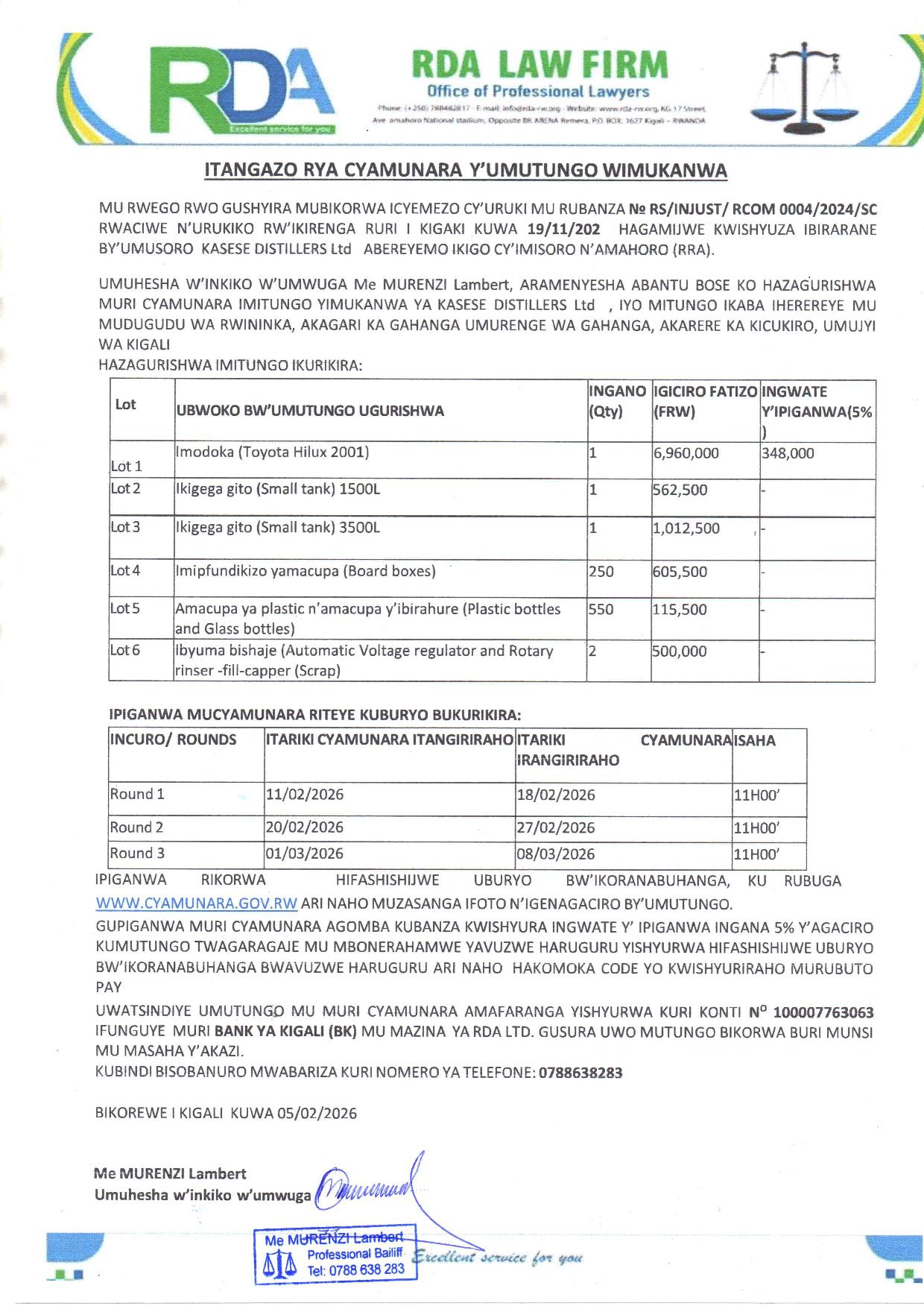 Kicukiro: Cyamunara y’imodoka n’ibindi bikoresho bitandukanye bya KASESE distillers Ltd biri mu murenge wa Gahanga, Akagari ka Gahanga, Umudugudu wa Rwinika