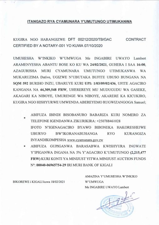 Gasabo: Cyamunara y’umutungo utimukanwa ugizwe n’ikibanza cyubatsemo inzu kibaruye kuri UPI: 1/02/10/04/720 (Sqm 643) mu murenge wa Kinyinya, Akagari ka Murama, mu mudugudu wa Binunga