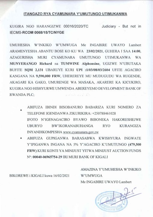 Gasabo: Cyamunara y’umutungo utimukanwa ugizwe n’ikibanza cyubatsemo inzu kibaruye kuri UPI: 1/02/10/04/720 (Sqm 643) mu murenge wa Kinyinya, Akagari ka Murama, mu mudugudu wa Binunga