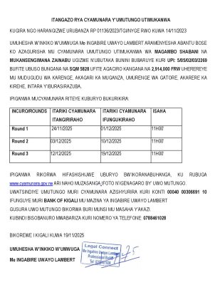 Kirehe: Cyamunara y’umutungo utimukanwa ubaruye kuri UPI: 5/05/02/03/2269 (Sqm: 5828); mu murenge Gatore, Akagari ka Muganza, Umudugudu wa Karenge