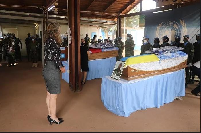 Abari mu butumwa bw’Umuryango w’Abibumbye bwo kugarura amahoro muri Repubulika ya Santarafurika, bafatanyije n’ubuyobozi bw’icyo gihugu, basezeye mu cyubahiro umusirikare w’u Rwanda Sgt NSABIMANA Jean d’Amour waguye muri iki gihugu mu bikorwa byo kugarura amahoro tariki 13 Mutarama 2021.