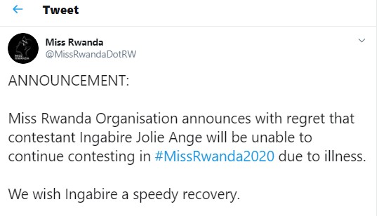 Mu gitondo cyo ku wa 17 Gashyantare 2020, mu ma saa tatu, bubinyujije ku rubuga rwa Twitter, ubuyobozi bushinzwe igikorwa cya Miss Rwanda bwatangaje ko Ingabire Jolie Ange (09) atashoboye gukomezanya n’abandi umwiherero kubera uburwayi.