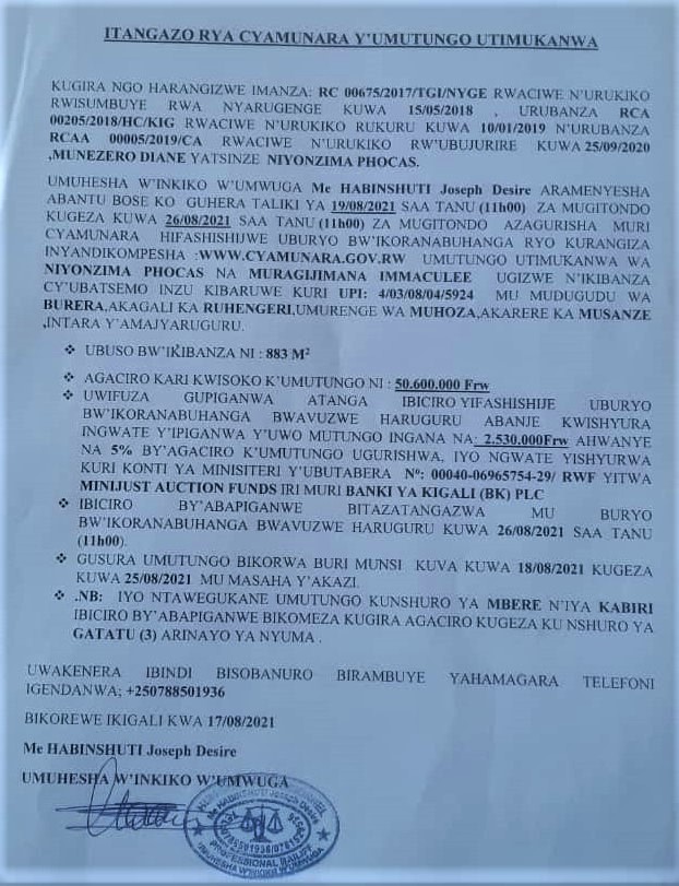 Gasabo: Cyamunara y’umutungo utimukanwa ugizwe n’ikibanza cyubatsemo inzu kibaruye kuri UPI: 1/02/10/04/720 (Sqm 643) mu murenge wa Kinyinya, Akagari ka Murama, mu mudugudu wa Binunga