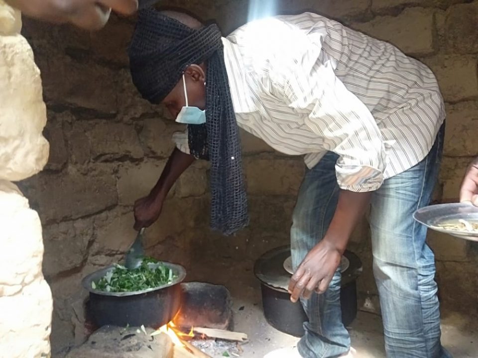 Ngirimana JMV na bagenzi we twabasanze bari mu gikoni batetse. Ni itsinda ry’abagabo cumi na batatu (13) n’abagore icumi (10). Barategura ubwoko butandukanye bw’ibiribwa biboneka aho batuye, kugira ngo babone indyo yuzuye.