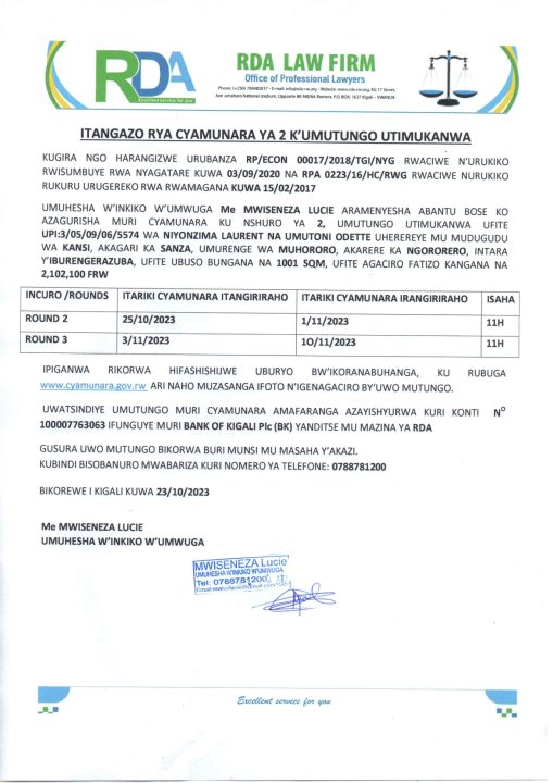 Ngororero: Cyamunara ku nshuro ya kabiri y’umutungo utimukanwa ubaruye kuri UPI: 3/05/09/06/5574 (1001 Sqm); mu murenge wa Muhororo, Akagari ka Sanza, Umudugudu wa Kansi
