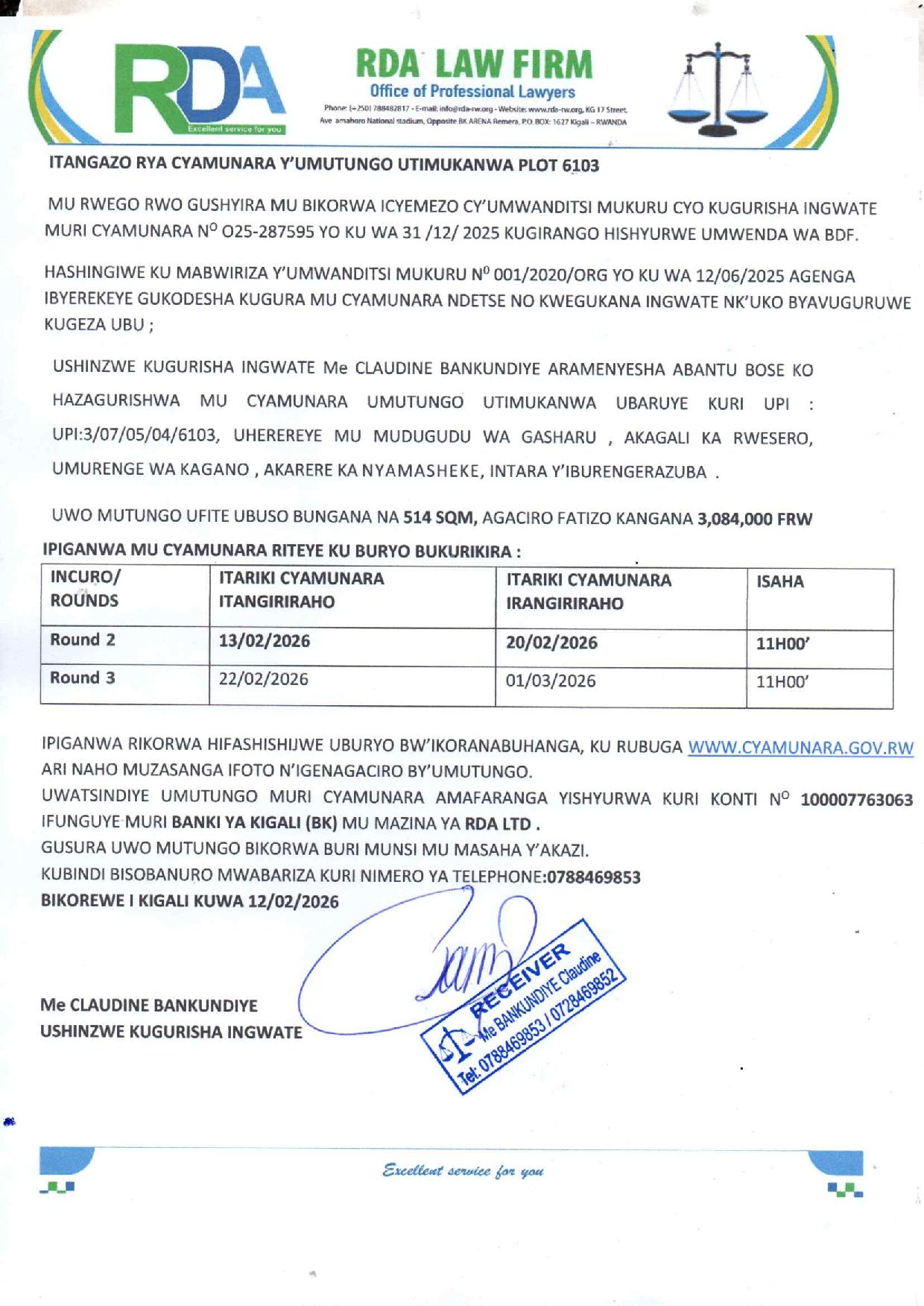 Nyamasheke: Cyamunara y’umutungo utimukanwa ubaruye kuri UPI: 3/07/05/04/6103 (Sqm: 514); mu murenge wa Kagano, Akagari ka Rwesero, Umudugudu wa Gasharu