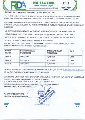 Nyamasheke: Cyamunara y’umutungo utimukanwa ubaruye kuri UPI: 3/07/10/01/2261 (Sqm: 106); mu murenge wa Macuba, Akagari ka Gatare, Umudugudu wa Kayenzi